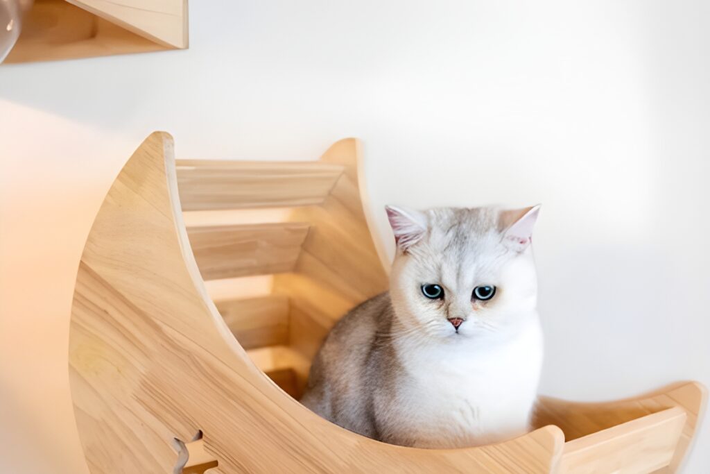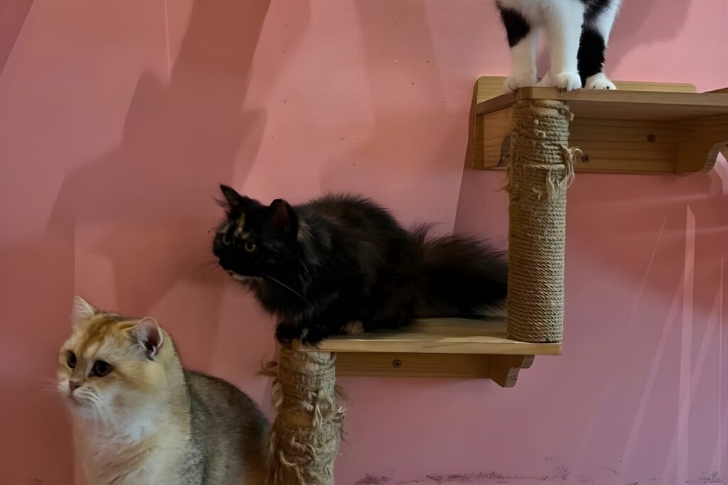 The space is designed specifically for feline comfort, including a dedicated cat lounge. The lounge features climbing structures, scratching posts, toys, and cosy resting spots that allow the cats to move around freely.