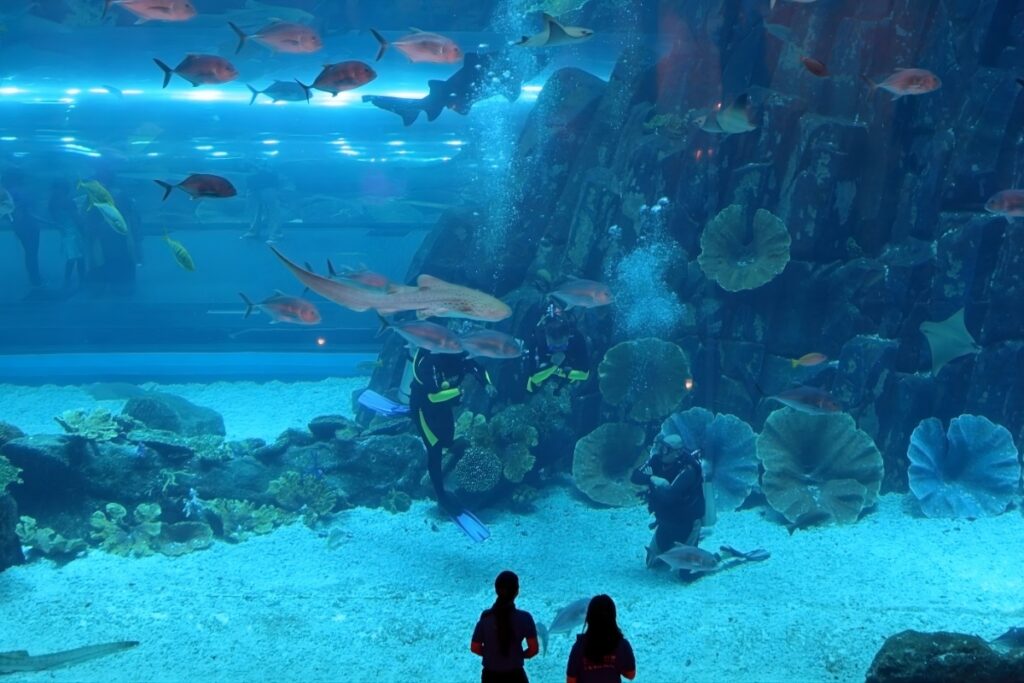 Inside the Dubai Mall, families can enjoy impressive views of the massive aquarium tank without purchasing a ticket. Large panels along the mall corridors allow children to watch sharks, rays, and other marine life up close.